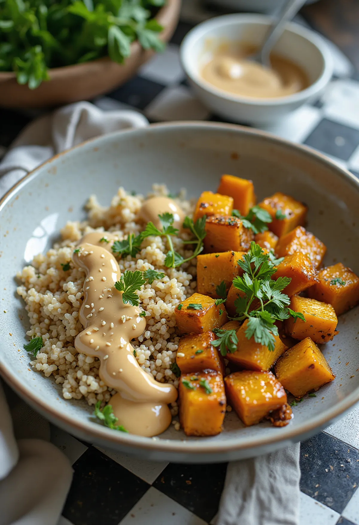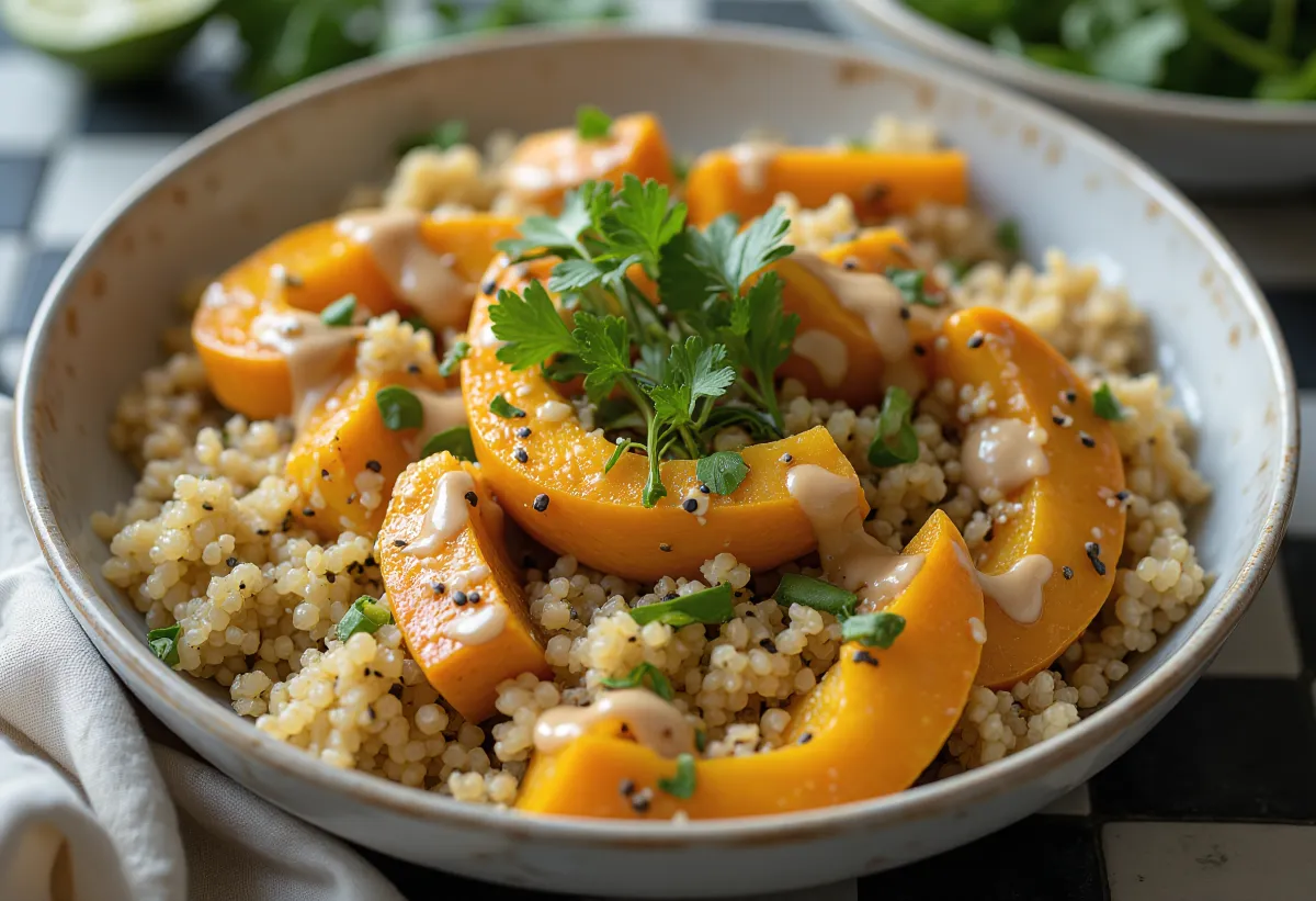 ブッダボウルの女王とも言えるこの料理は、すべての要素が役割を持っています。キヌアは満足感のあるベース、かぼちゃは甘い安らぎ、ライム豆腐はタンパク源、そしてタヒニは「ケーキの上のアイシング(最後の一押し)」です。味の層と食感の多様性が、この料理を忘れられないものにします。